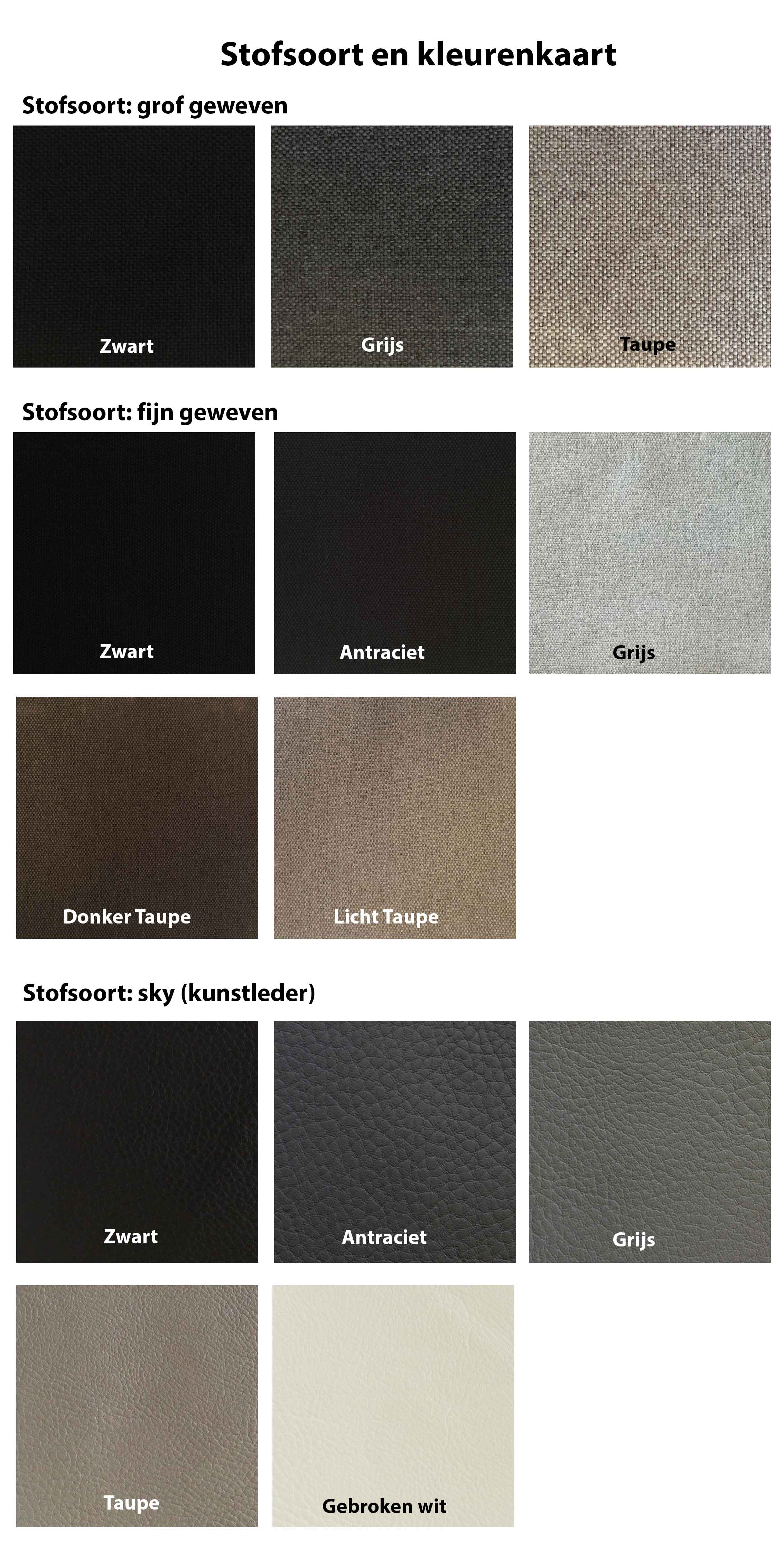 Kies de stofsoort en kleur. Klik hier voor de stofsoort en kleurenkaart. U heeft de keuze uit 3 verschillende stofsoorten met elk hun eigen uitstraling. Onze fijn geweven stof geeft uw boxspring een mooi moderne en luxe uitstraling. De grof geweven stof zorgt voor een lekker stoer en robuust uiterlijk. Onze sky (lederlook) geeft uw boxspring een mooie strakke en frisse uitstraling. Sky is overigens ook erg gemakkelijk schoon te houden.