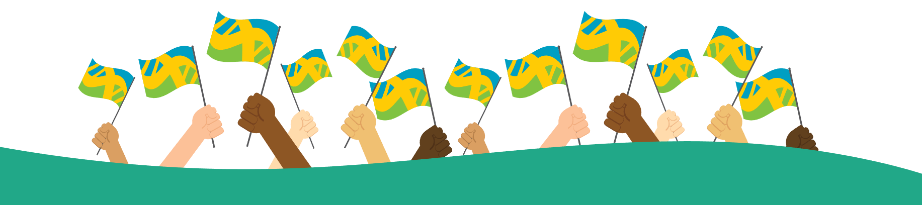 De Mensenrechten vlag is een kleurige vlag met een doordacht ontwerp. Er is veel dat ons als mensen met elkaar verbindt: we delen de aarde, de lucht en een plek onder de zon. En hoe verschillend we ook kunnen zijn qua uiterlijk: als mensen bestaan we allemaal uit DNA.